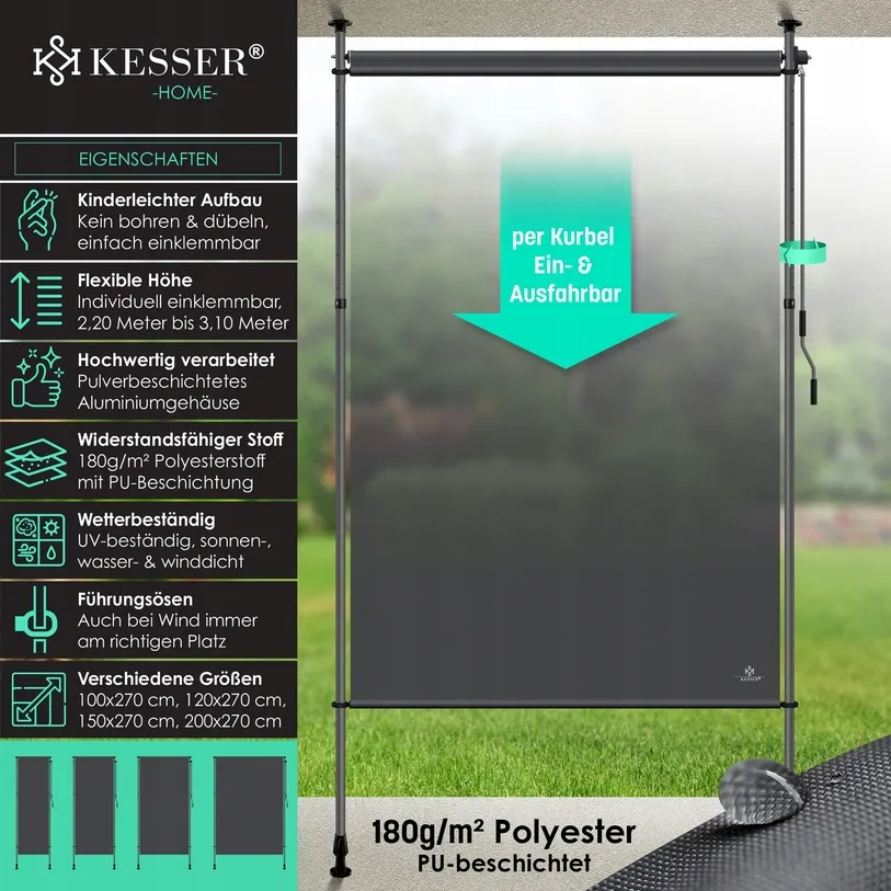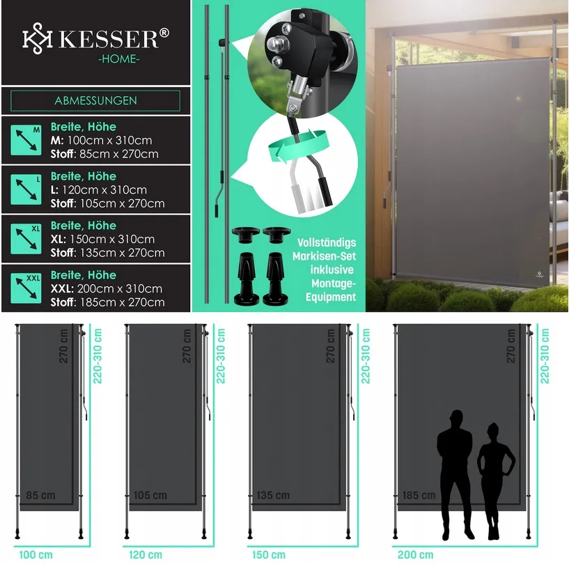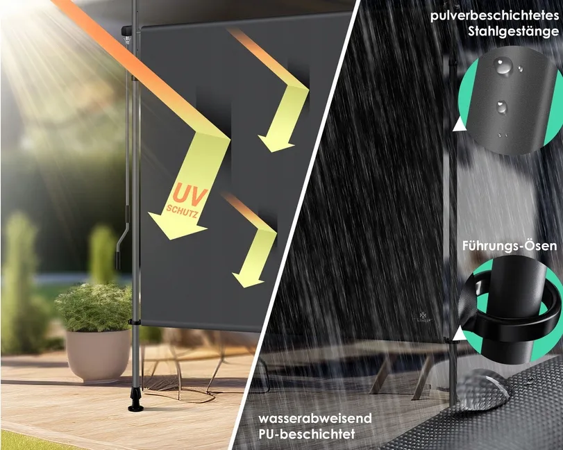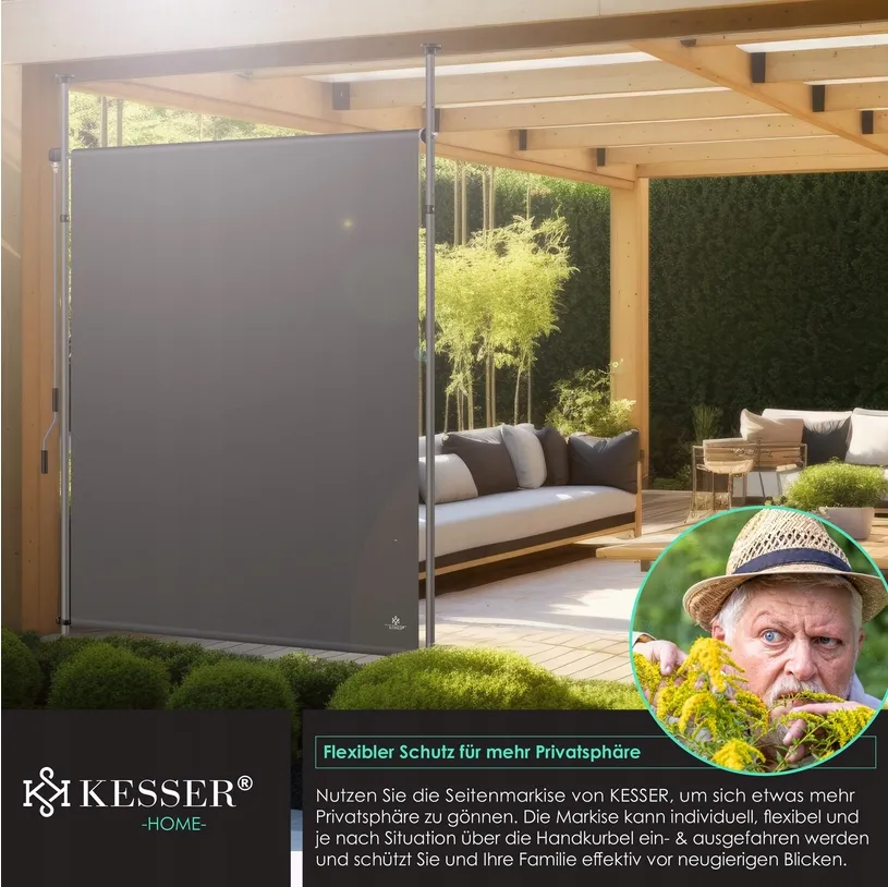 Stwórz zaciszne miejsce do odpoczynku na świeżym powietrzu dzięki markizie pionowej KESSER. Regulowana wysokość, odporne na warunki atmosferyczne materiały i łatwy montaż bez wiercenia sprawiają, że zyskasz prywatność i komfortowy cień, idealny do relaksu czy popołudniowej drzemki.