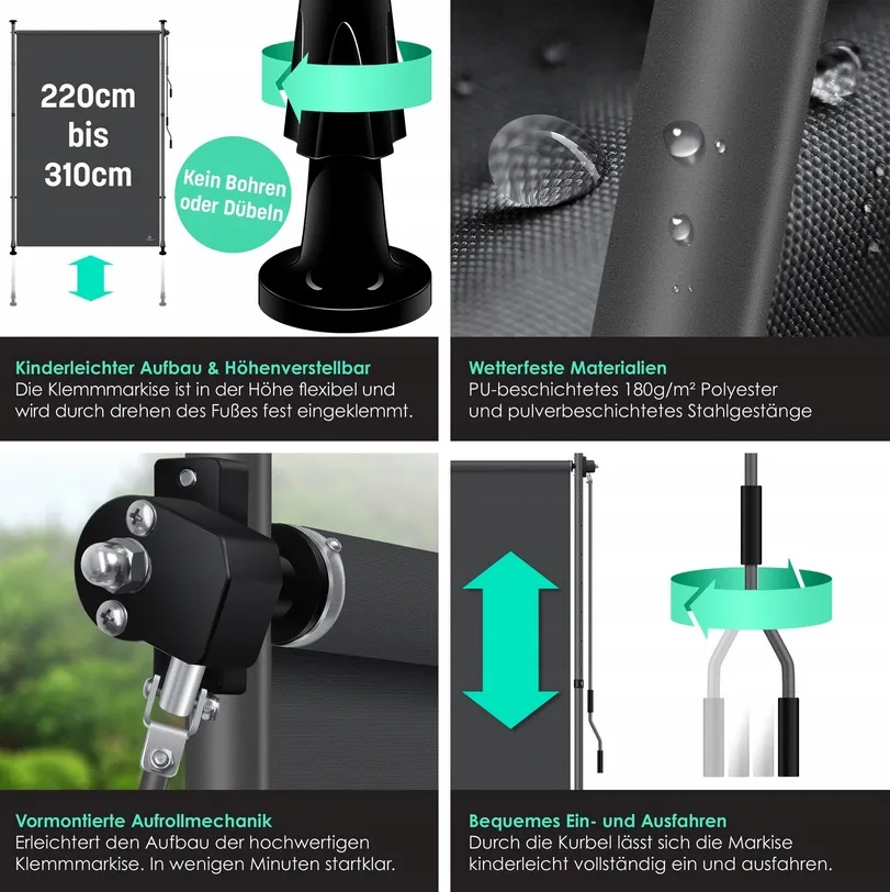 Solidna aluminiowa konstrukcja z powłoką proszkową gwarantuje długotrwałą wytrzymałość, a prowadnice stabilizują markizę nawet przy silniejszym wietrze. Ręczna korba pozwala szybko i wygodnie dostosować poziom osłony, dzięki czemu w kilka chwil stworzysz idealne warunki do relaksu.
