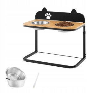Nasze miski dla psów na stojaku wspomagają prawidłowe karmienie pupila dzięki 3-stopniowej regulacji wysokości. Są odpowiednie zarówno dla średnich jak i dużych psów. Stelaż składa się z metalowej ramy w kształcie litery "L", która zapewnia wysoką stabilność i z zabezpieczonego blatu bambusowego, który jest mocny i odporny na pęknięcia. W zestawie znajdują się również 2 wyjmowane miski ze stali nierdzewnej na karmę i wodę oraz biały marker do rysowania po tablicy.