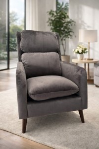 Stylowy i wygodny fotel tapicerowany w kolorze szarym, idealny do salonu lub sypialni. Komfortowe siedzisko, solidne drewniane nogi oraz nowoczesny design sprawiają, że fotel doskonale sprawdzi się jako miejsce relaksu i elegancki element wystroju wnętrza.