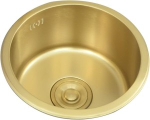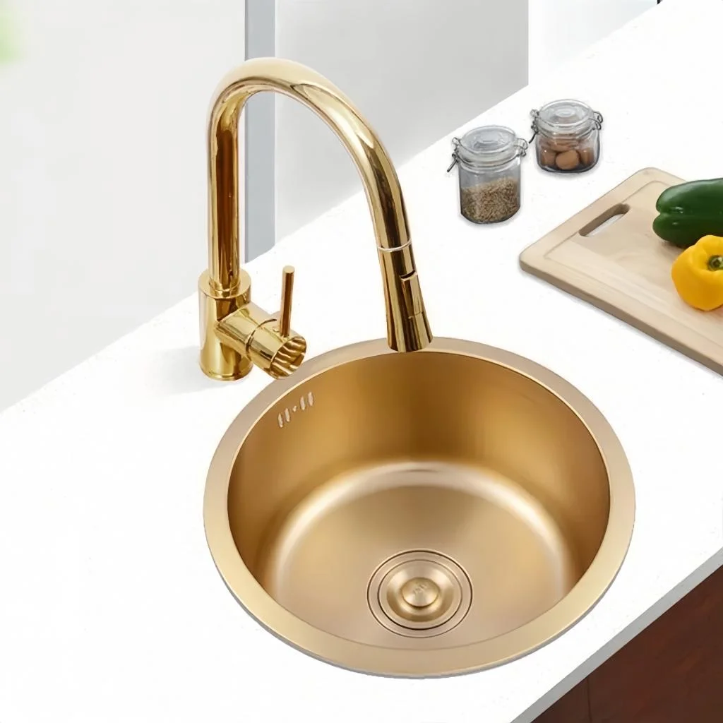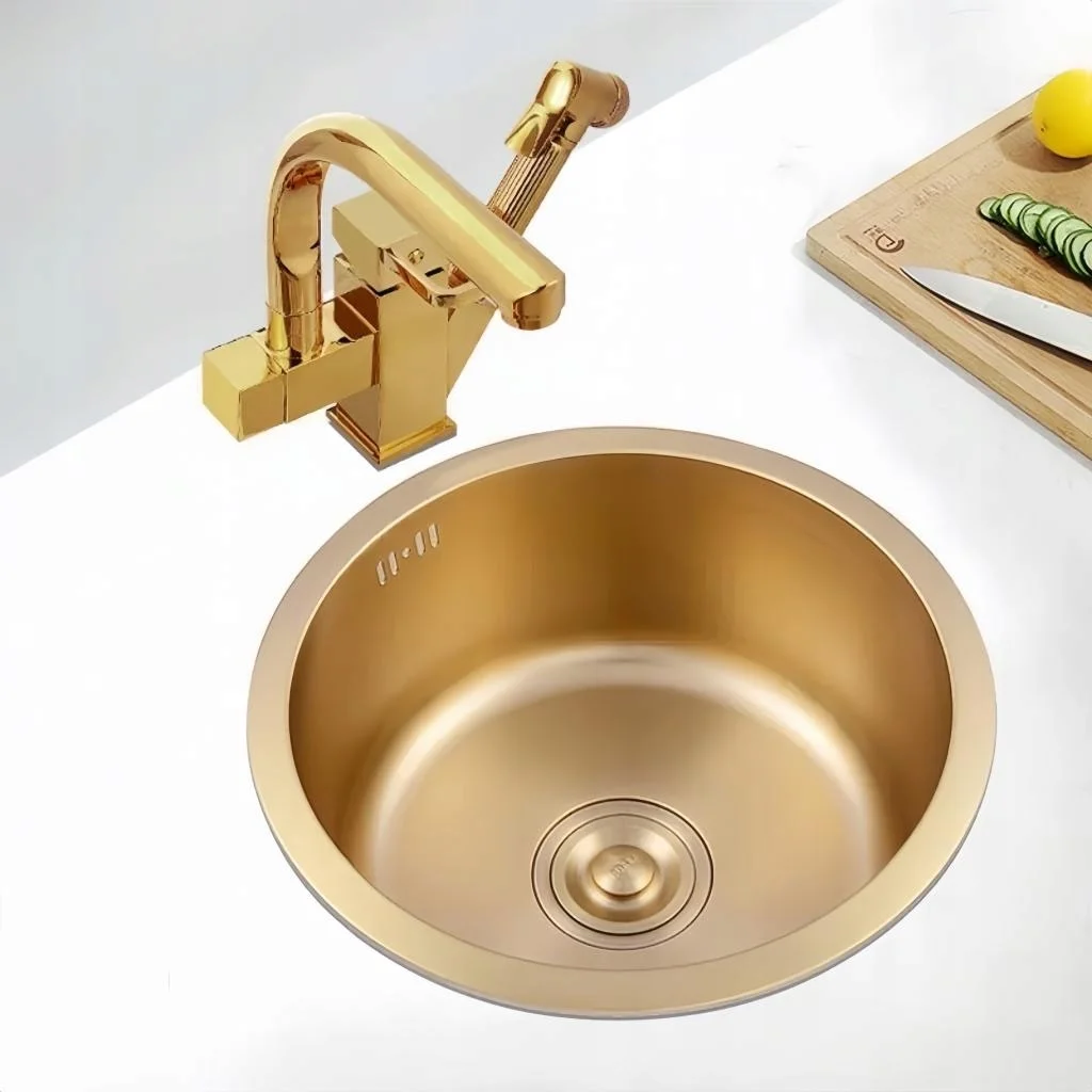 Elegancki, okrągły zlewozmywak nablatowy w kolorze złotym, wykonany ze stali nierdzewnej 304. Idealny do kawalerek, aneksów kuchennych, barów i małych kuchni. Trwały, łatwy w czyszczeniu i pojemny.