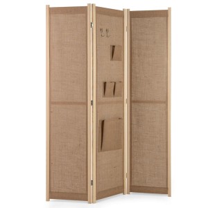 Funkcjonalny parawan pokojowy z 3 średnimi kieszeniami, 1 dużą kieszenią i 2 haczykami. Wykonany z syntetycznego lnu na drewnianym stelażu. Składana konstrukcja, wysokość 170 cm. Idealny do salonu, sypialni i biura.