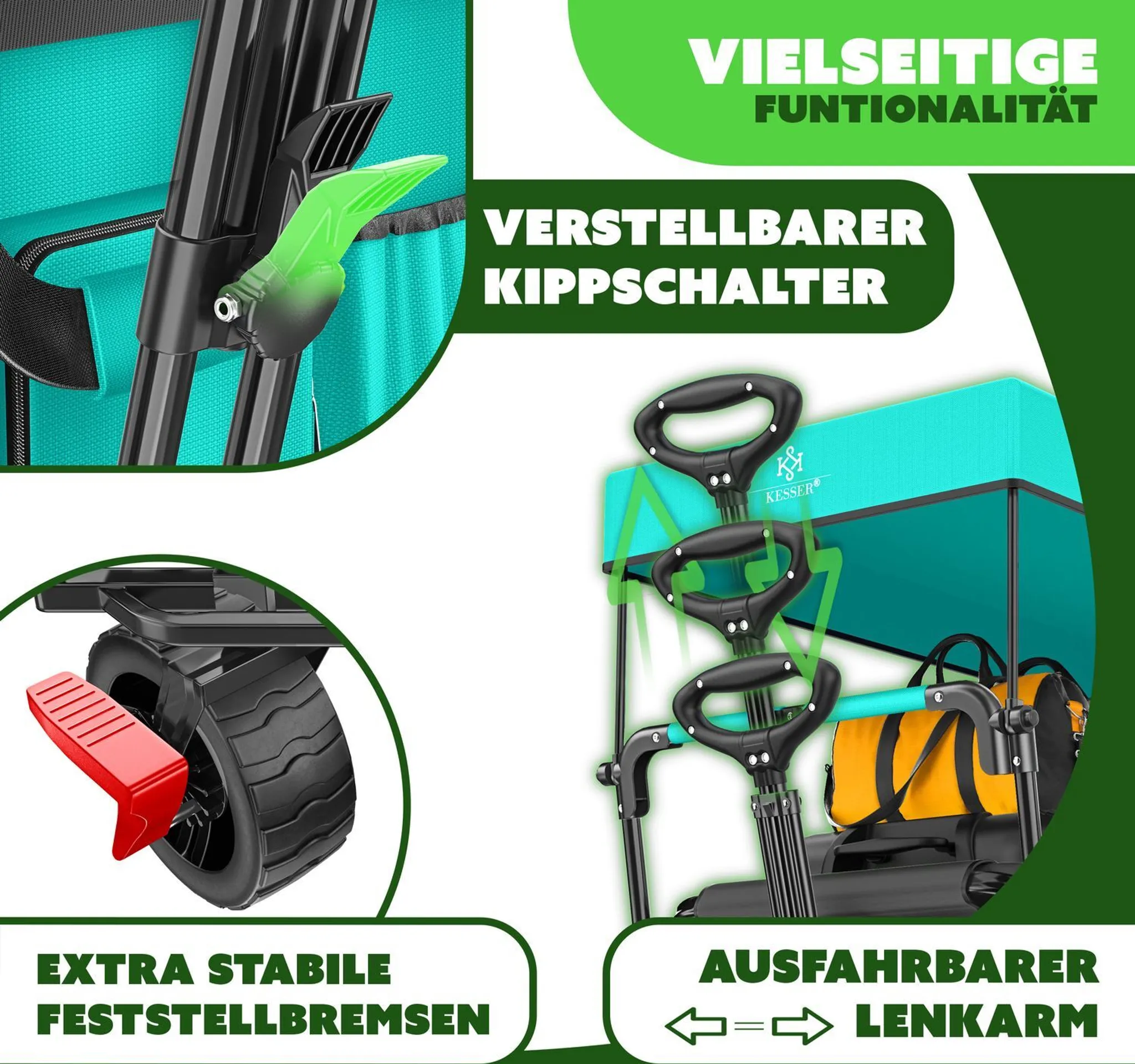 Praktyczny, składany wózek GT-9000 z daszkiem przeciwsłonecznym, torbą XXL i kołami obrotowymi 360° to idealne rozwiązanie na wycieczki, zakupy, kemping czy festiwale. Solidna konstrukcja i udźwig do 80 kg gwarantują niezawodne użytkowanie w każdych warunkach.