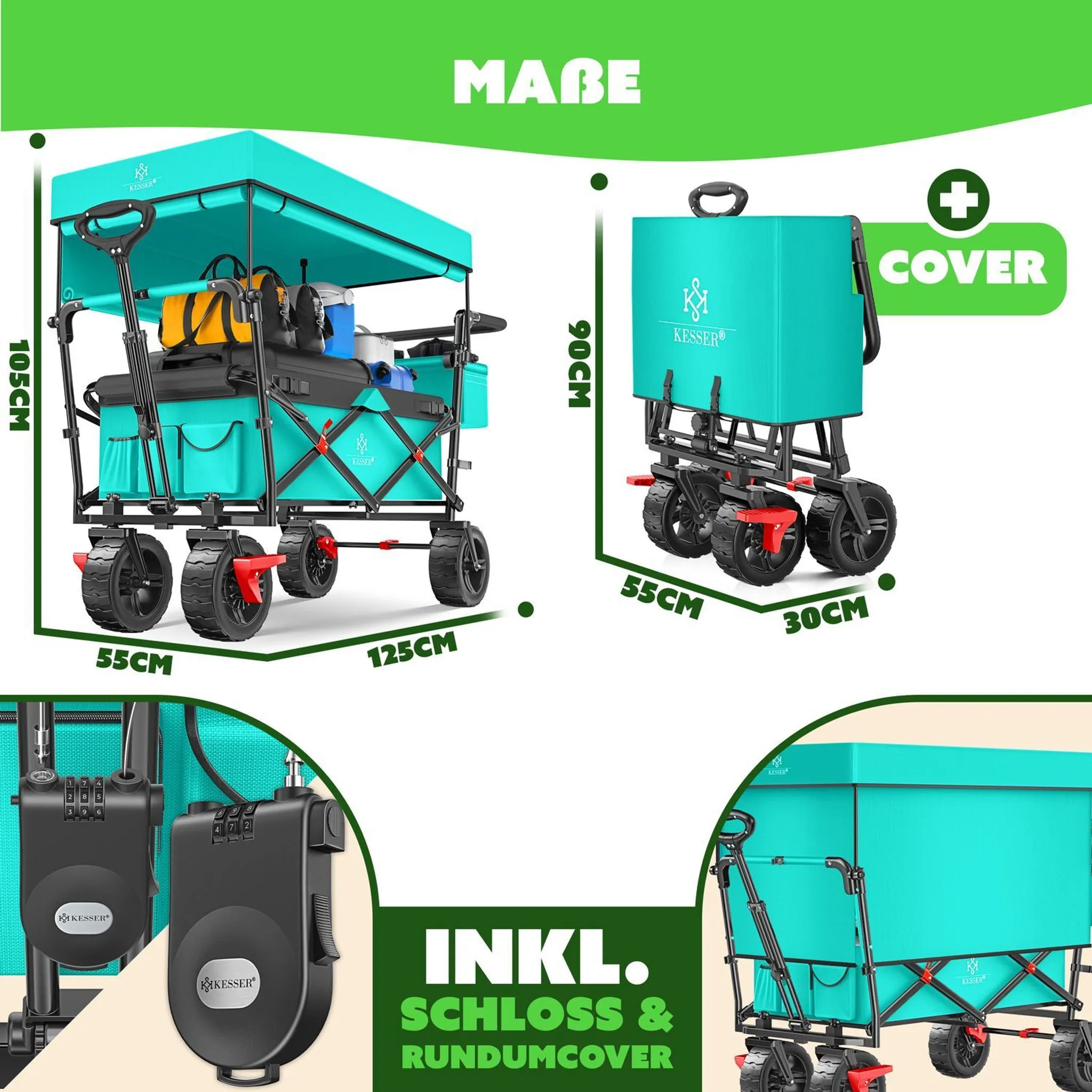 Obrotowe o 360° przednie koła i funkcjonalny uchwyt z regulacją wysokości zapewniają komfort manewrowania. Wózek posiada dwa uchwyty – do ciągnięcia i pchania – oraz solidne hamulce. Dzięki zamkowi i osłonie ochronnej, zawartość wózka jest bezpieczna zarówno podczas postoju, jak i transportu.