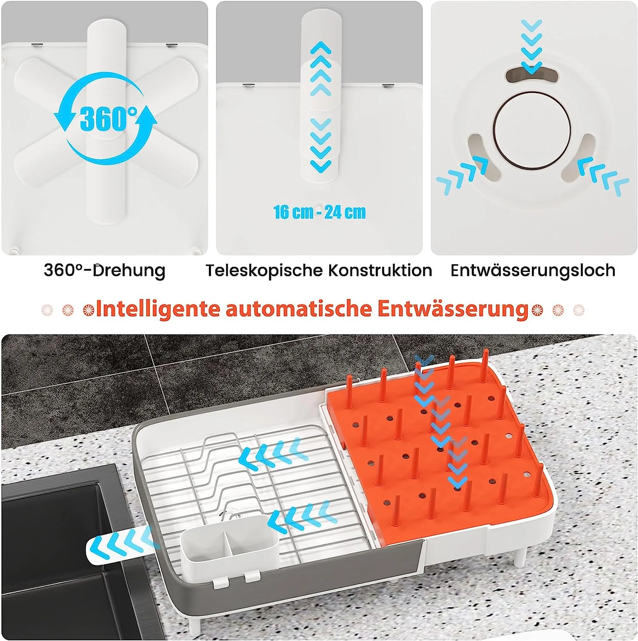 Funkcjonalny ociekacz na naczynia z wysuwaną konstrukcją i automatycznym odpływem. Wykonany ze stali nierdzewnej i tworzyw PP oraz TPE. Wyposażony w uchwyty na sztućce i kubki, obracaną wylewkę 360°, antypoślizgowe nóżki i łatwy montaż.