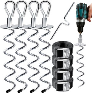 Każda kotwa wyposażona jest w metalowe oczko, przez które bezpiecznie przeciągniesz dołączony pas mocujący z klamrą zaciskową. Dzięki temu zestawowi skutecznie zabezpieczysz m.in. trampoliny, huśtawki, altany, namioty imprezowe, kosze do koszykówki czy plandeki przed silnym wiatrem i przemieszczaniem się.